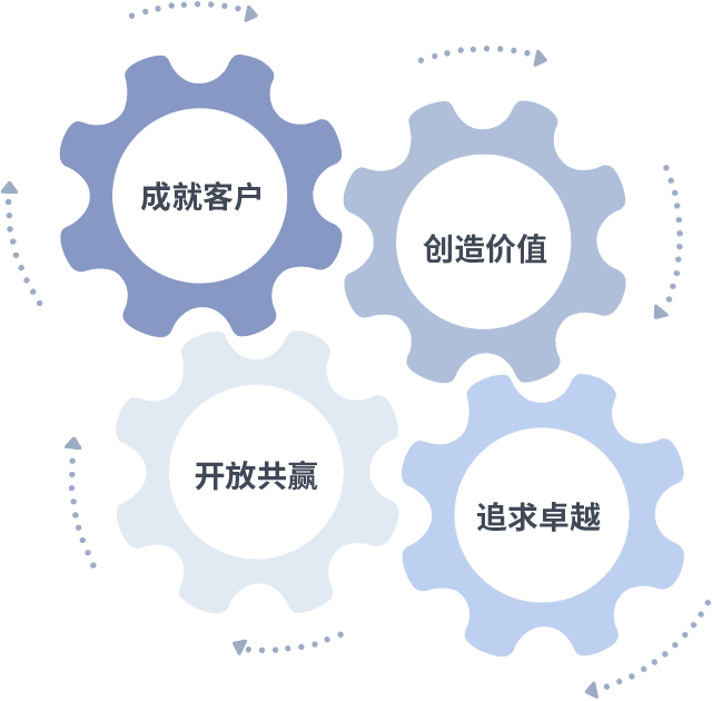成就客户是一切决策的出发点,,创造价值是衡量所有工作的标准,,,追求卓越是我们做事做人的态度,,开放共赢是我们的格局也是最终的结果。。价值观的齿轮环环相扣,,,,推动着组织里的每个人不断向前。。。